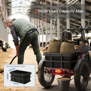 - Heavy-Duty Pickup-Class Tricycle: Built with durable aluminum alloy and a Golden Ratio chassis for stability, it supports 350–500 lbs. The rear-wheel differential ensures balanced turns, and hydraulic brakes offer reliable stopping power. Comes with a spacious rear basket (19.68" x 17.5" x 10.2") for groceries, gear, or cargo.
