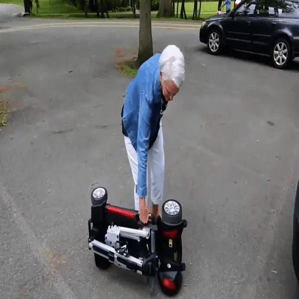 - Foldable: this scooter can be easily folded thanks to its automatic folding system with remote control, so you can easily store and transport the electric scooter for the disabled in minutes. It can be charged when folded.